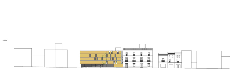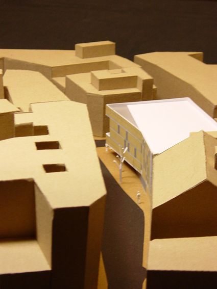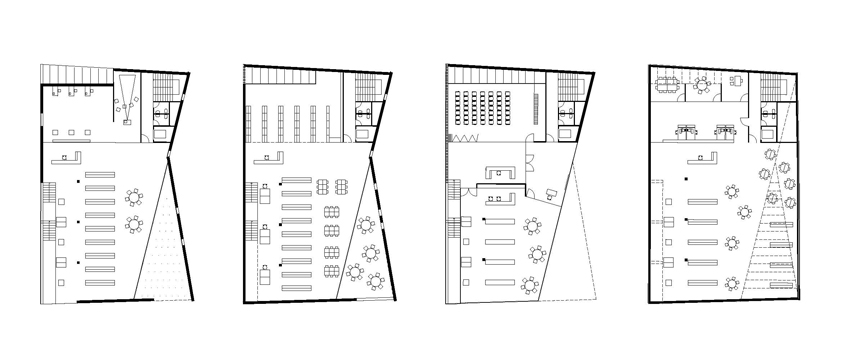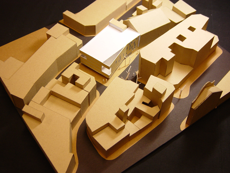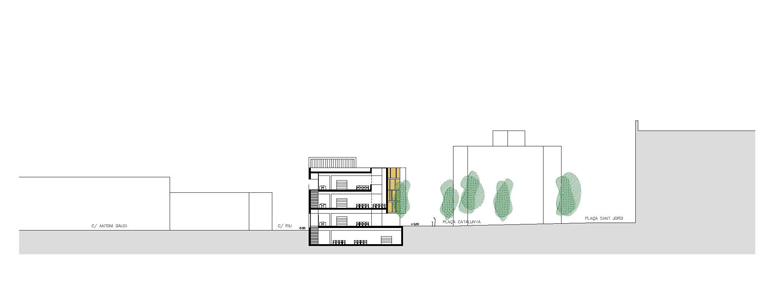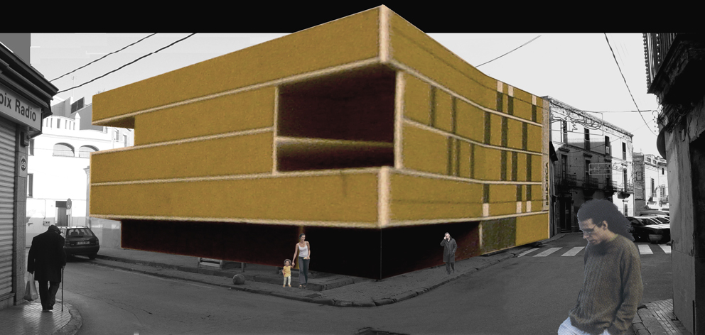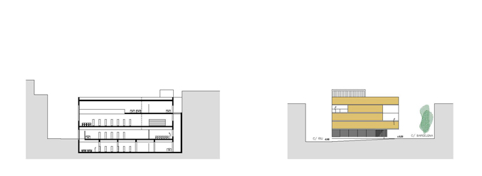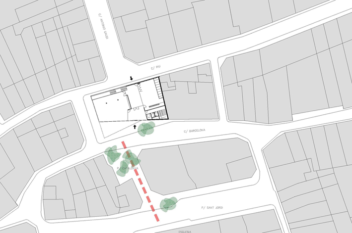 El projecte parteix d'un solar ocupat per l'antic Mercat Municipal. S'opta per fer desaparèixer l'edifici del mercat degut a l'absència de qualsevol element digne de conservació. La proposta preveu un bloc compacte, que allibera el màxim d'espai possible en planta baixa per tal d'aconseguir un espai d'accés a l'edifici. El tancament en aquesta planta es recula, mentre que la façana en les plantes pis fa un plec seguint l'alineació del carrer. Amb aquest doble gest es provoca un eixamplament de l'espai de vorera per a la organització dels accessos. En planta baixa s'opta per un tancament el màxim vidrat per tal de donar transparència i la sensació de travessar l'edifici només amb la mirada. L'interior, que en aquesta planta aflora a fora per donar transparència i anunciar el que a dins es produeix com si fos un aparador, més amunt es converteix en introversió mostrant unes façanes més hermètiques que només s'obren en punt molt concrets i controlats, permetent espais més tranquils i aptes per a la lectura. L'edifici es planteja amb dos accessos oposats. De manera que el vestíbul es planteja com un lloc de pas. Tot i que l'accés principal es formalitza, per tal que l'accés sigui fàcilment identificable, produint-se sota el voladiu que emergeix i s'apropa per acollir i orientar als visitants. L'edifici s'organitza en quatre nivells, un d'ells sota rasant. La planta soterrani l'ocupen la zona infantil i la zona de treball intern. En planta baixa es disposa la zona d'acollida i promoció, amb el vestíbul, la sala polivalent i l'àrea de revistes. En planta primera i segona, interconnectades entre sí, la zona d'informació i fons general.