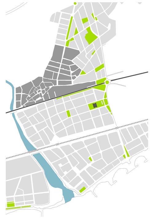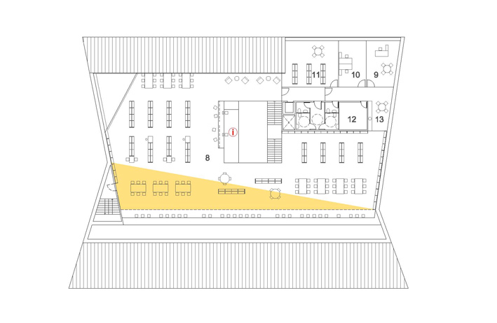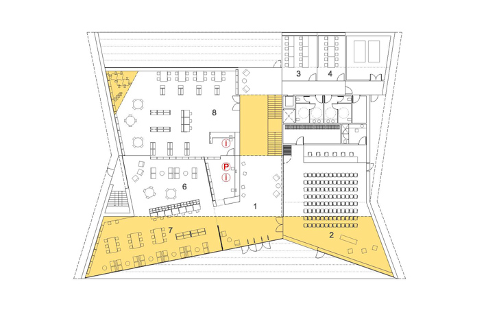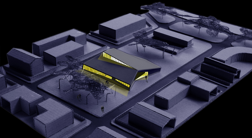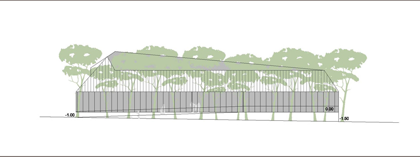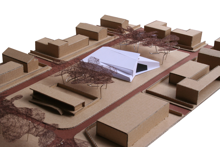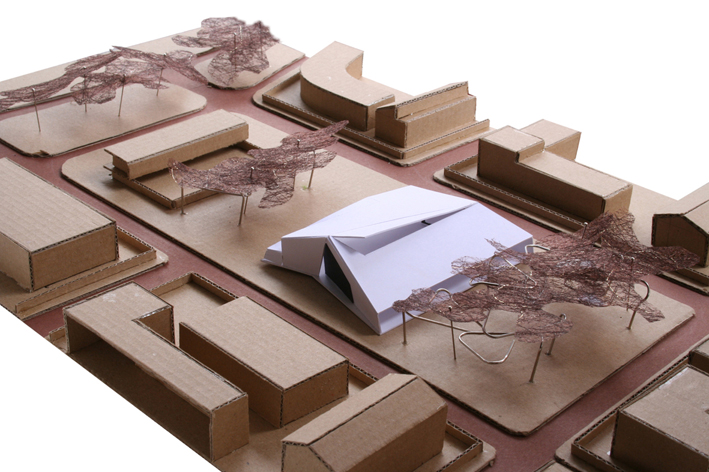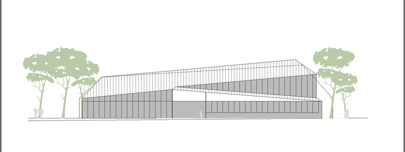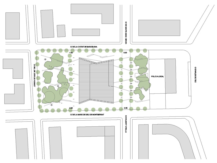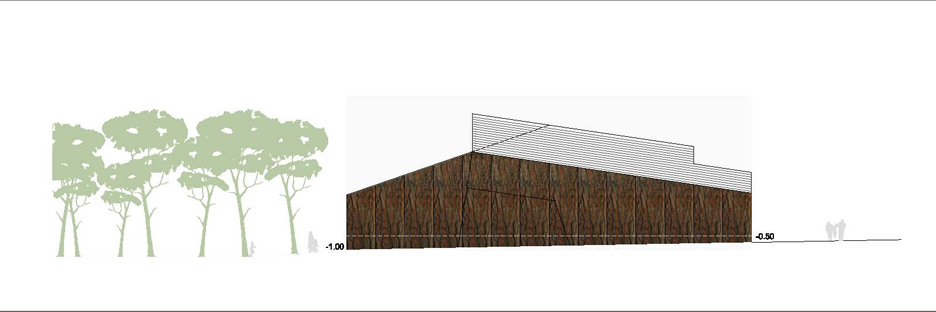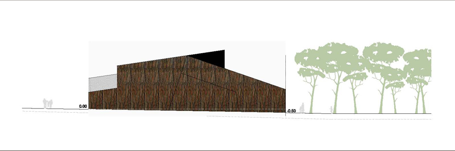La proposta parteix de la idea d'aconseguir un tractament global de tot el solar com un gran parc al mig del qual emergeix la biblioteca com una peça amagada i fusionada dins l'arbrat. La biblioteca aflora a la superfície com si sempre hagués estat allí, el pla del terra s'expandeix cap amunt cercant nous espais, el volum inicial compacte entra en tensió i s'esquerda, i la llum s'introdueix, fins a les parts més baixes i interiors, mitjançant un procés de fragmentació. La transparència i apertura a l'exterior de l'edifici en planta baixa juntament amb els plecs dels grans murs laterals, enfatitzen la idea de que el parc travessa l'edifici. L''espai exterior es conduit cap a l'interior i l' interior es projecta cap a l'exterior com a prolongació del que un llegeix a dins. La nova volumetria s'enten com una peça sinuosa en secció per tal d'encabir el programa i alhora permetre que l'edifici en la proximitat amb el parc adquireixi una dimensió més propera, familiar i doméstica per a minimitzar i suavitzar la seva presència en l'entorn, de manera que quan el visitant s'apropa l'edifici es dibuixa lentament, a poca alçada, entre la vegetació. Els plecs dels murs són formes quebrades que obeeixen al flux de la gent, al anar i tornar, i acompanyen al vianant. El joc de cobertes que pugen, baixen, es quebranten...és el mecanisme que permet, simultàniament, guanyar alçades als espais interiors i, alhora, filtrar i captar la llum natural. A dins, els dobles espais acabaran de portar la llum als espais inferiors. Els murs de formigó texturitzat, que evoquen amb el seu relleu la textura de l'escorça dels pins, cerquen un diàleg i una fusió amb l'arbrat existent. La coberta ondulant i zigzaguejant es converteix en l'autèntica façana urbana, creant un paisatge de dunes metàliques.