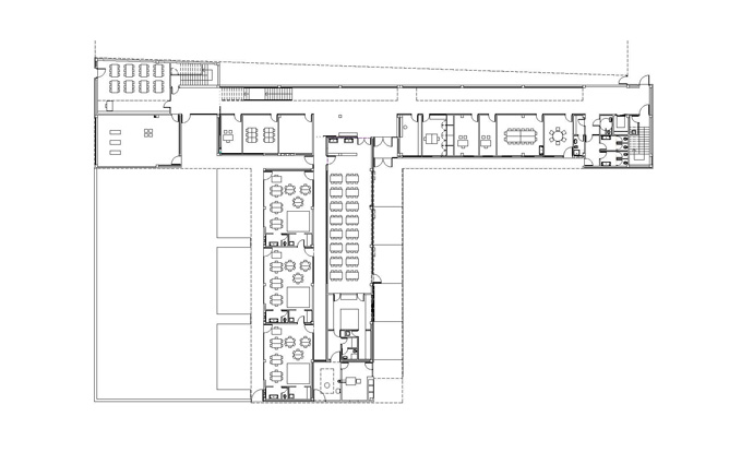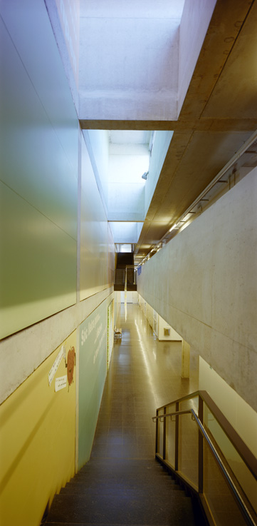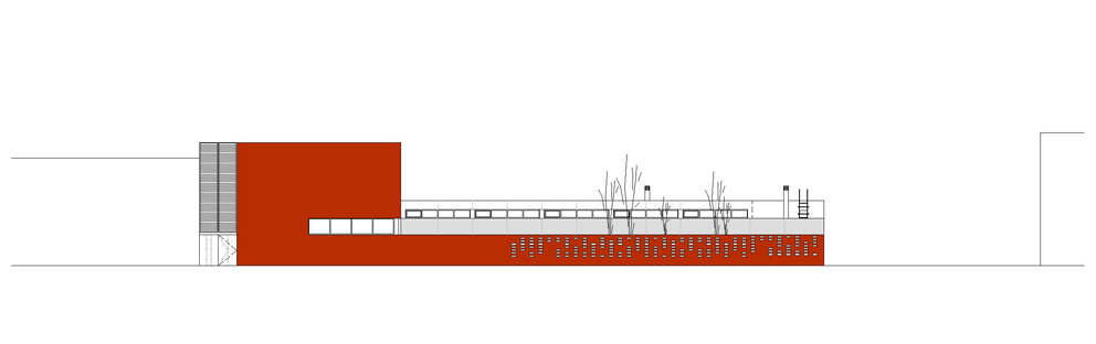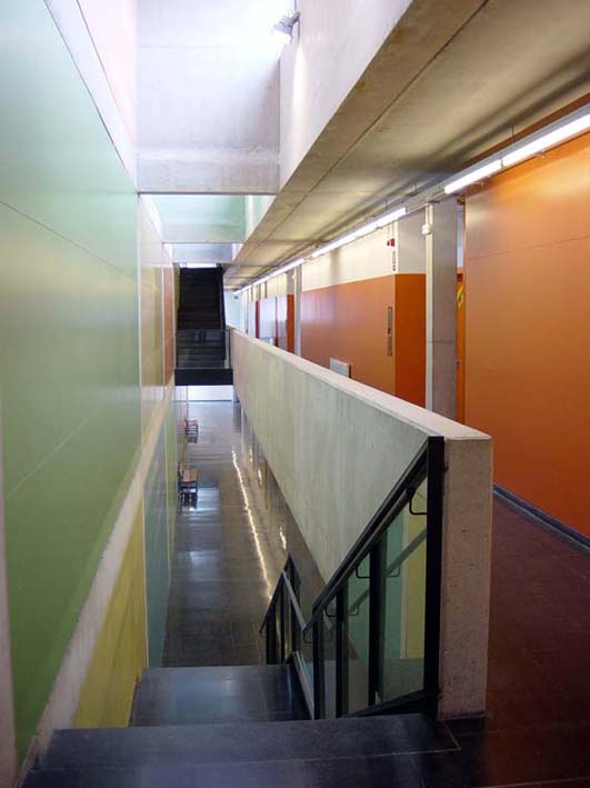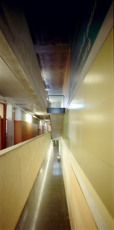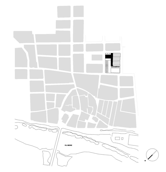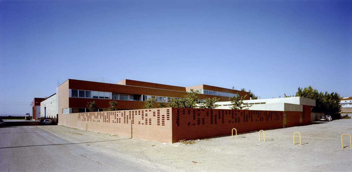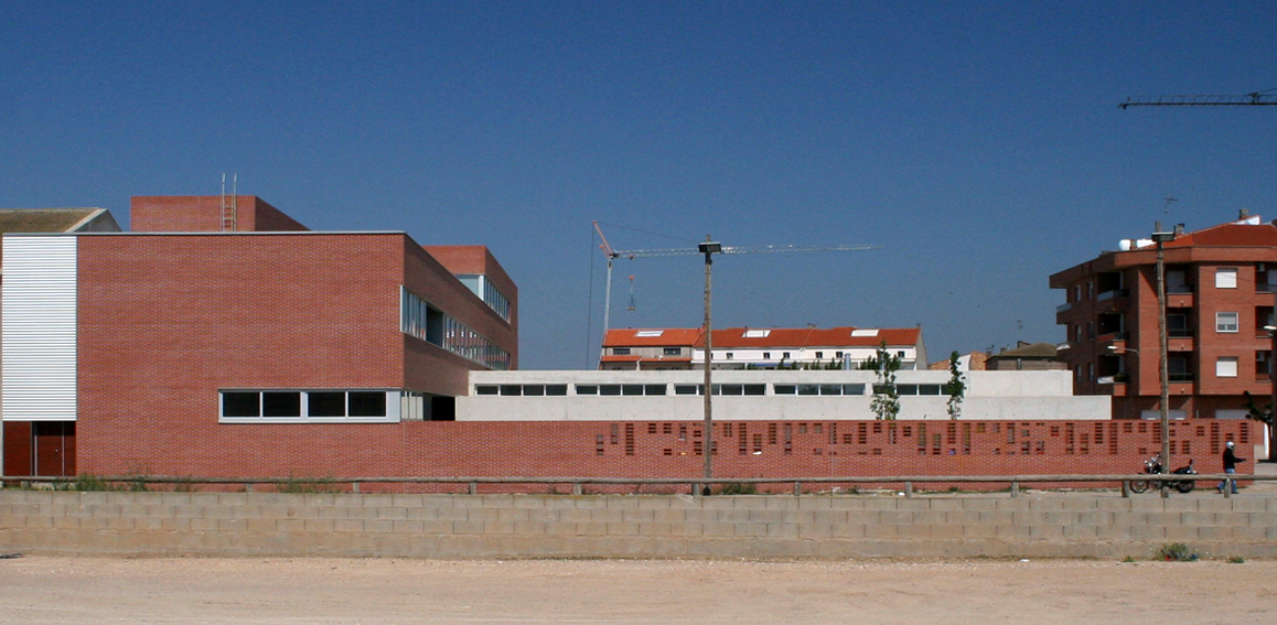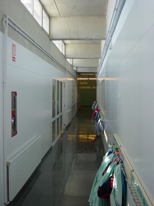 El solar del projecte, se situa en un entorn dispers i encara en fase de construcció i consolidació. Moltes parcel•les són buides i d'altres es troben ocupades per naus que pertanyen a una tipologia i escala diferent. La parcel•la en qüestió comparteix illa amb tres d'aquestes naus plantejant la problemàtica de com integrar les corresponents mitgeres dins el recinte de l'escola. L'edifici, en resposta, crea el seu propi àmbit pel desenvolupament de les activitats escolars. Opta per donar l'esquena a les naus i obrir-se cap al poble, única referència a nivell d'ordenació i relació amb l'entorn, amb l'església i l'horta en darrer terme. El volum principal es col•loca revestint la mitgera de les naus, com a nova pell i actuant com a teló de fons de l'accés. El cos més baix, destinat al cicle d'educació infantil i menjador, se situa de forma perpendicular marcant l'entrada i independitzant els patis d'infantil i primària. El recorregut sota el porxo serveix d'espai previ de transició, de manera que l'aproximació a l'edifici sigui més pausada i tranquil•la. Un cop dins el vestíbul, tot és diferent. Una franja de llum zenital banya el mur del fons, que revesteix la gran mitgera, il•luminant el triple espai lineal de les escales, que es converteix en un joc d'endevinalles per als més petits.