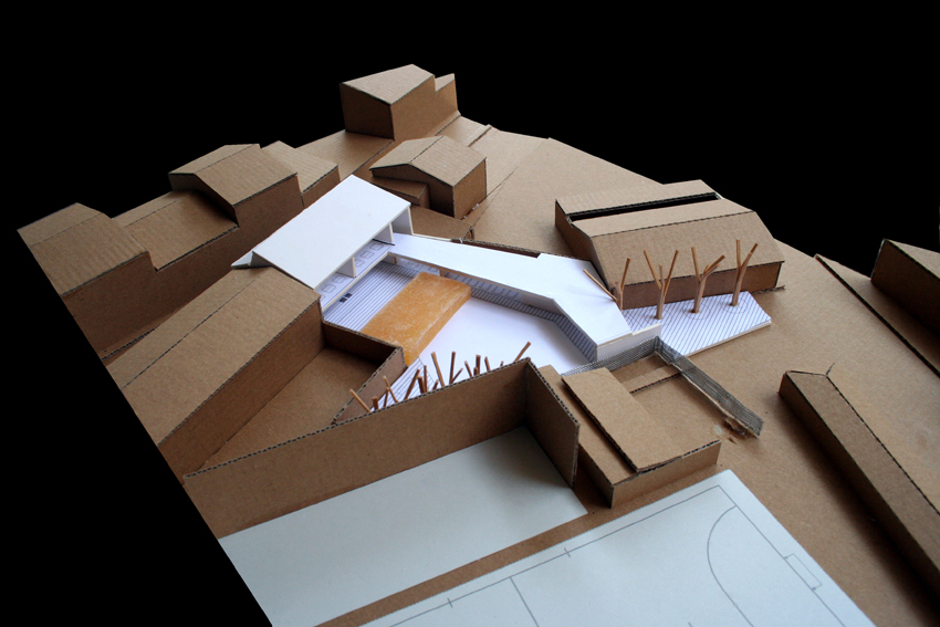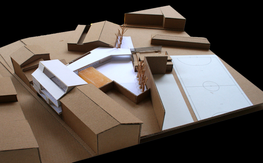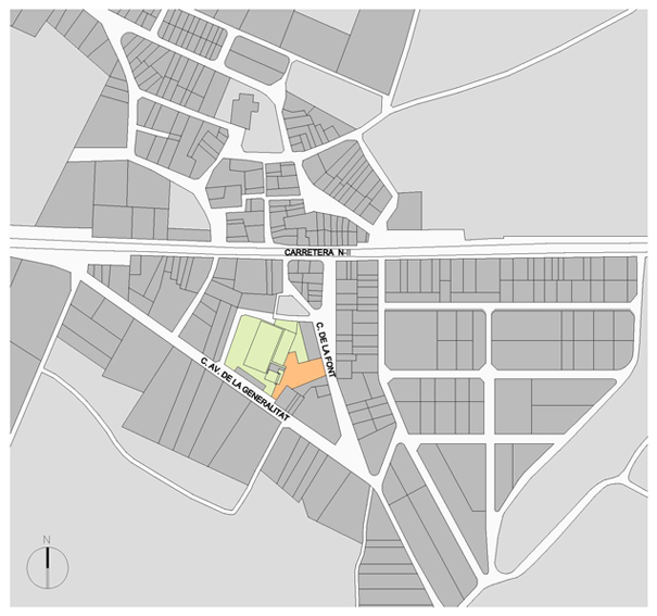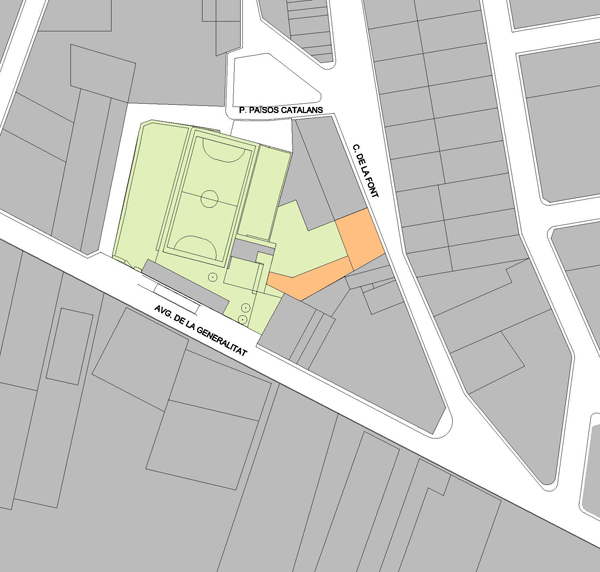 Es planteja que l'accés principal a nivell d'alumnes sigui des del carrer de la Generalitat. Es preveu que, degut a la proximitat de la pista esportiva i vestidors, l'escola pugui utilitzar aquestes instal•lacions. Aquest fet fa que sigui important la relació que s'estableix entre el nou edifici docent i l'equipament esportiu, cercant una proximitat d'accessos. Alhora, la recent construcció de la llar d'infants municipal amb accés des del carrer de la Generalitat així com la disposició de la major part del programa d'aulari del nou edifici a la planta baixa (cota pati) i planta primera són fets que reforcen la idea de plantejar l'accés per aquest cantó. Per produir l'accés al nou centre escolar s'aprofita la recent adequació de l'accés a la nova llar d'infants que ha comportat un eixamplament de l'espai de vorera, creant un lloc de trobada per a la organització dels accessos, les esperes i transicions. Des del punt de vista urbà, el projecte parteix de dos principis: d'una banda, recollir la traça del carrer de la Font situant-se al costat d'uns habitatges adossats amb alineació a vial, mantenint la profunditat edificable de 12 m marcada pels mateixos i mantenint un ordre dins una illa caracteritzada per una multitud de directrius i un desordre generalitzat, i d'altra banda recollir l'accés al centre des del carrer de la Generalitat de manera que la planta baixa sobresurt per acollir al visitant.