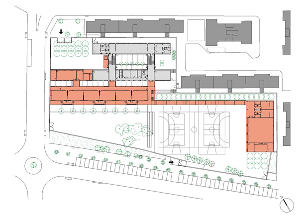 L'edifici del Centre d'Educació Infantil i Primària La Vinyala es situa al carrer Sant Josep 99, de Sant Vicenç dels Horts. El recinte de l'escola limita al SO amb el carrer Claverol de recent urbanització, al NO amb el carrer Sant Josep/Avda Torrelles, al NE amb diversos edificis d'habitatges de considerable alçada i amb el carrer de La Vinyala. Inicialment, dins el recinte es trobaven 3 edificacions: l'antiga caseta del conserge, un edifici de dues plantes corresponent a educació infantil i l'edifici principal de planta baixa i tres que encabia el programa d'educació primària, administració, menjador i petita sala de gimnàs, les quals tenien grans deficiències no complint la normativa vigent. La proposta, que només conserva l'últim d'aquests 3 edificis, tracta de regularitzar i ordenar els diferents espais exteriors alhora que intentar aconseguir una bona connexió i orientació de les diferents peces de programa. L'edifici d'ampliació destinat a educació infantil es situa al sud-oest de l'edifici principal com una tercera franja de programa en planta baixa convertint-se en sòcol de l'alçat principal. Això permet compactar el programa deixant la resta d'espai lliure com a pati. Aquest fet queda reforçat, alhora, mitjançant la col•locació del nou volum del gimnàs al SE del pati a la zona menys assolellada, on es situava l' edifici d'infantil enderrocat. La connexió amb el gimnàs es planteja a cobert mitjançant un gran porxo lineal.