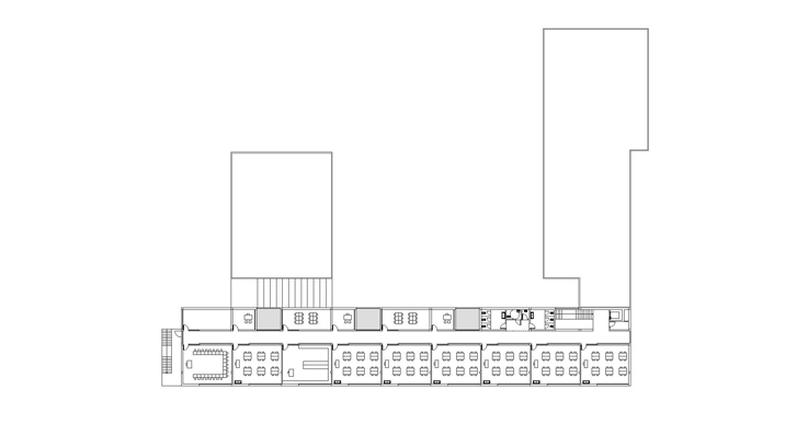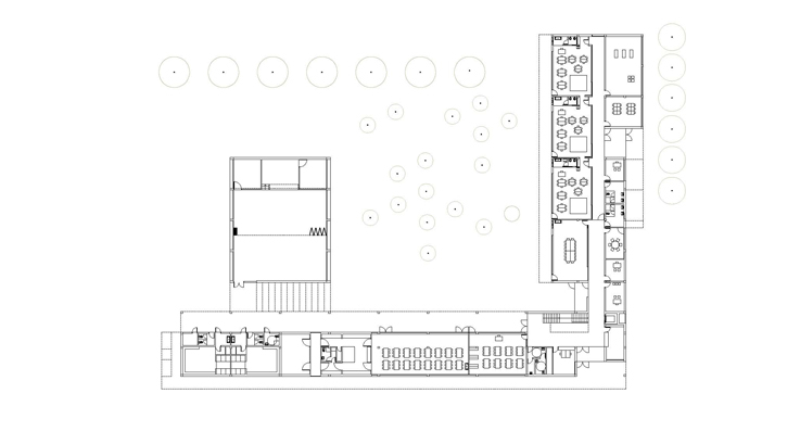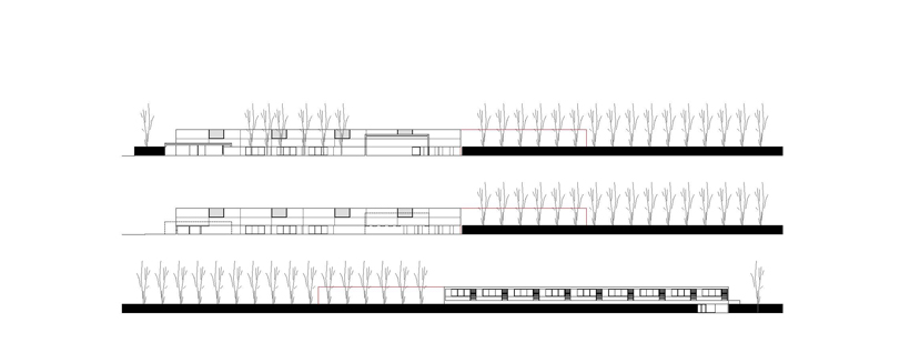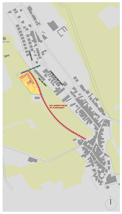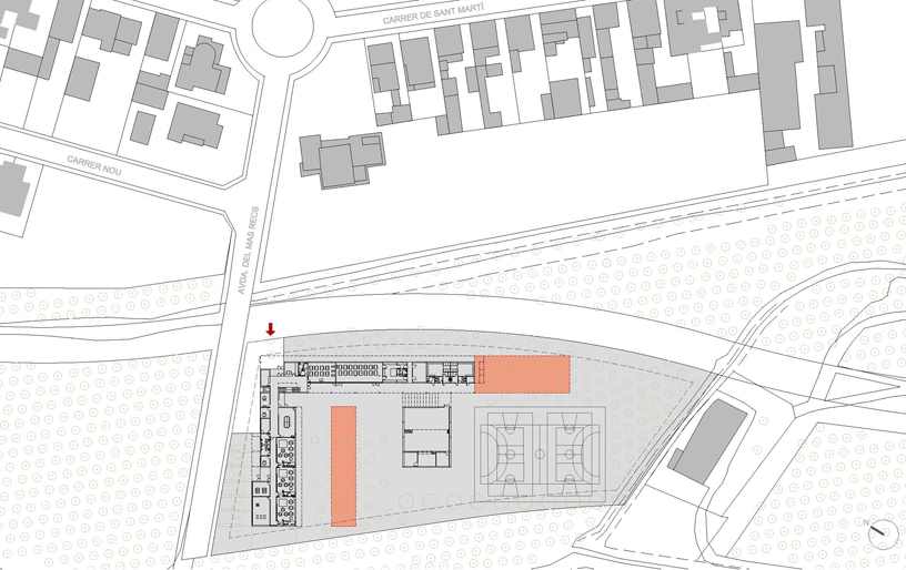 L'edifici es desplaça cap a la cantonada nord del solar, dirigint la seva mirada cap al bosc. El projecte es recolza en el nou carrer previst pel planejament (que unirà l'escola amb el centre) obrint-se cap a l'espès bosc, invitant al paisatge a penetrar dins l'edifici. El volum de les aules d'infantil i el del gimnàs se situen conformant uns patis que ajuden a ordenar l'espai exterior i, alhora, funcionen com a espais intermedis entre l'exterior i l'interior. Es cerquen zones exteriors més acotades i acollidores contrastant amb el tamany desmesurat i desprotegit del bosc, d'aquesta manera l'exterior penetra de forma gradual dins l'edifici. Dins del solar es conserven part dels arbres existents, de manera que l'edifici amb la seva implantació, volumetria i formalització es fusiona amb la trama atapeïda d'arbres fent que els límits del solar es desdibuixin, cercant la màxima integració entre arquitectura i natura. Es planteja l'accés per la cantonada nord del solar recollint l'arribada peatonal. S'independitzen els dos patis, infantil i primària, permetent així un segon accés a l'àrea d'infantil. L'edifici s'articula en tres volums: dos de més petits de només d'una planta (infantil i gimnàs) sobre els que es recolza el cos gran (primària). En el punt d'unió dels cossos més baixos amb el més alt es situa vestíbul, espai d'articulació del programa. Es compacta en gran part fugint d'esquemes excessivament dispersos i aprofitant la possibilitat de construir dues plantes. El programa es distribueix amb passadissos centrals, però sempre cercant que aquests espais gaudeixin de la llum necessària. En planta baixa es disposen diversos envidraments col•locats estratègicament i en planta primera apareixen unes terrasses de forma alternada com a talls que cerquen la llum.