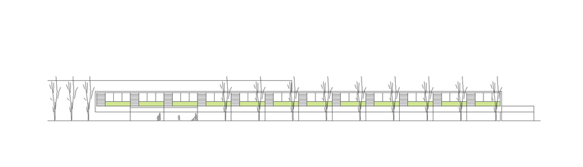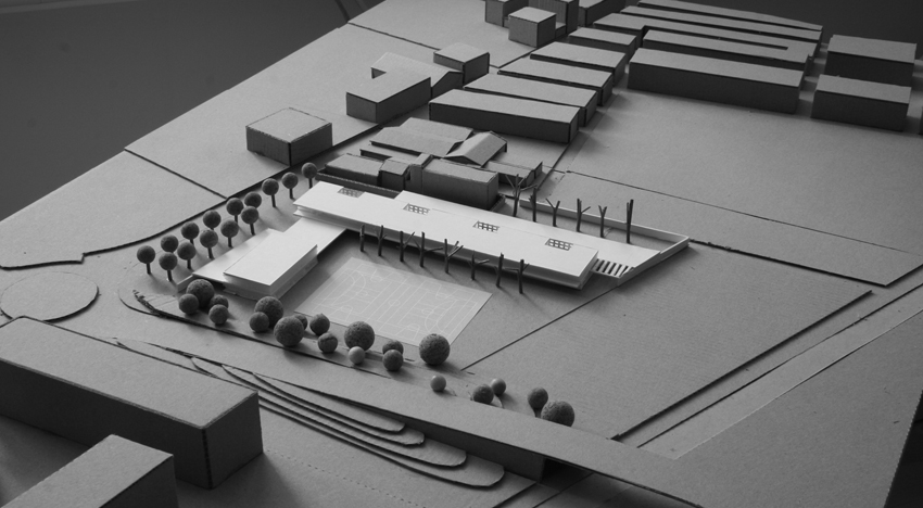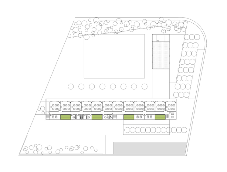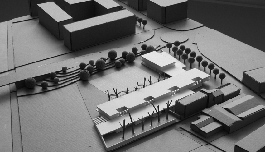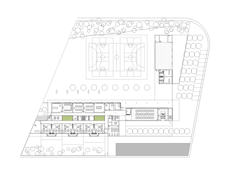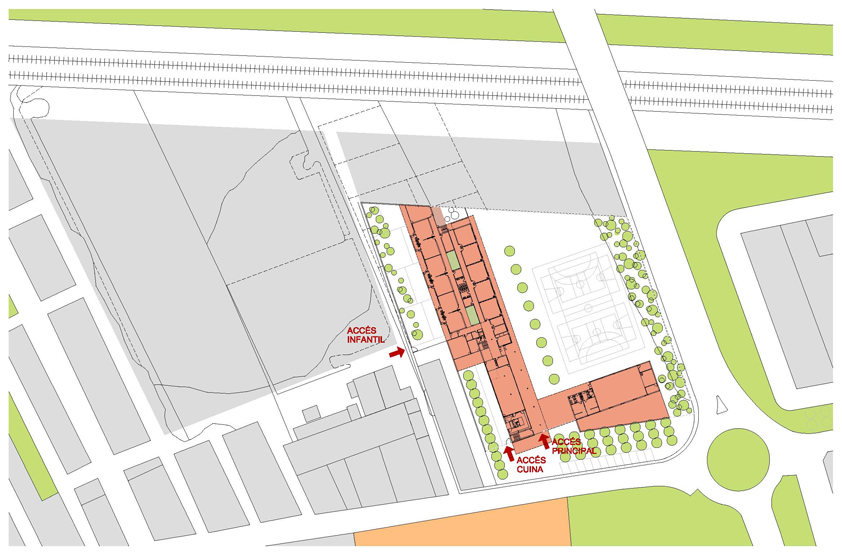 )El projecte parteix de dos principis: d'una banda, recollir simultàniament la traça existent del carrer Rubí que prové de la trama característica del Raval i la traça del carrer Barcelona (eix important de comunicació); i de l'altre cercar, amb la seva disposició i formalització les millors vistes i orientació. L'edifici d'aulari es disposa segons la directriu del Raval tradicional. L'edifici es desplaça lateralment cap a la cantonada sud-est, dirigint majoritàriament la seva mirada al nord. Mentre que les aules d'infantil, més introvertides i amb el seu propi pati, es giren enrera, cap al sud, cercant la bona orientació i la màxima tranquil•litat. L'escola s'allunya dels sorolls ocasionats pel trànsit rodat i s'apropa al barri per tal de gaudir de la tranquil•litat d'aquest. El pati de primària i el talús natural amb una frondosa massa d'arbres seran els encarregats d'atenuar el soroll constant del trànsit. Es planteja un accés secundari a infantil a través del seu propi pati. El fet de independitzar els dos patis, infantil i primària, permet que per la seva posició el primer sigui fàcilment accessible des de l'exterior, sense necessitat de passar pel vestíbul. Per tal de compactar més l'edifici, tant a la planta baixa com a la primera, el programa es distribueix amb passadissos centrals, però sempre cercant que aquests espais gaudeixin de la llum necessària. Es disposen una sèrie de petits patis de forma alternada com a talls que cerquen la llum i que serveixen alhora per il•luminar i afavorir la ventilació natural i creuada d'espais centrals i espais de circulació.