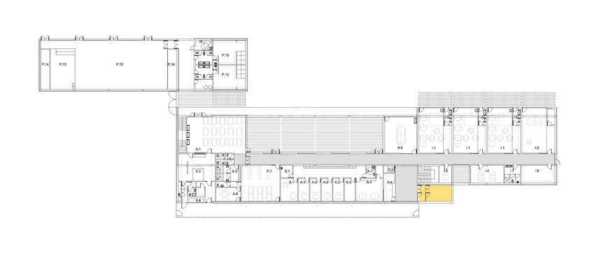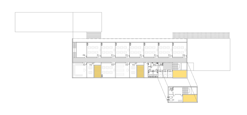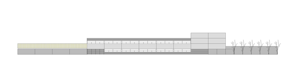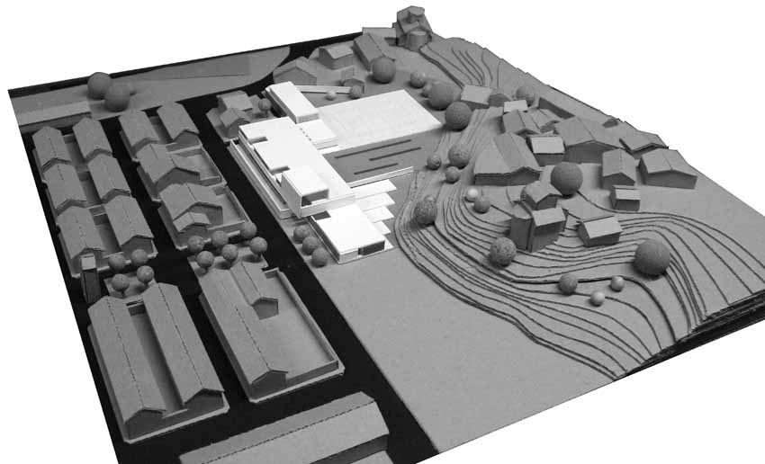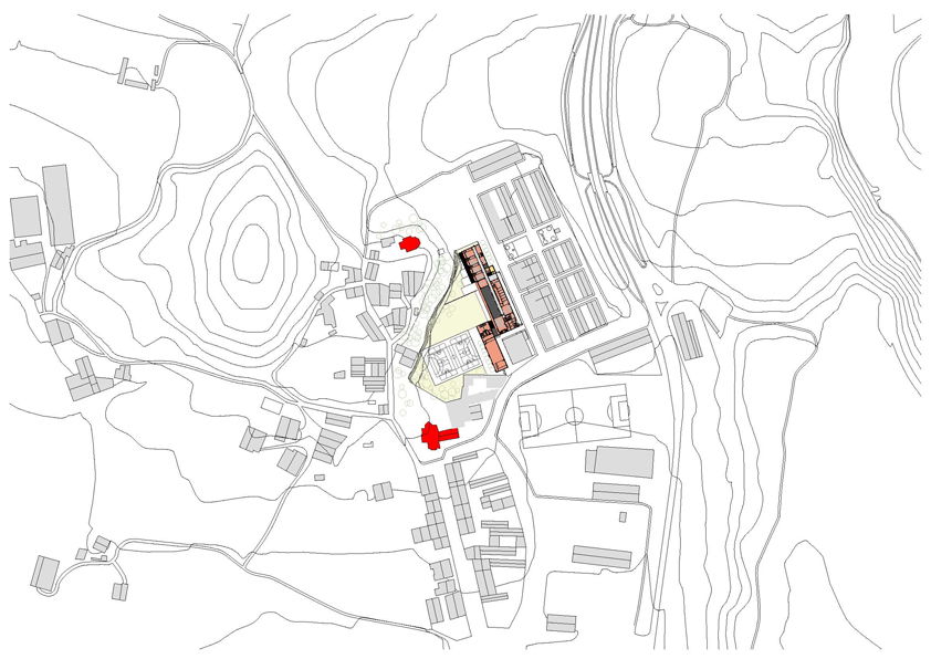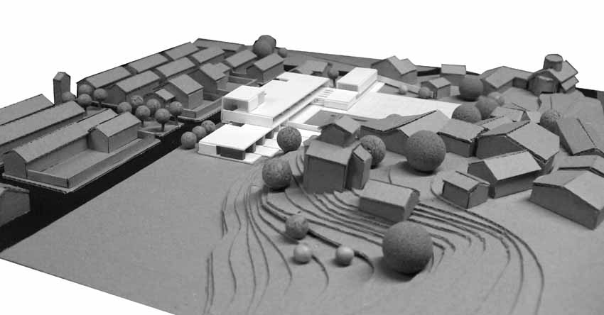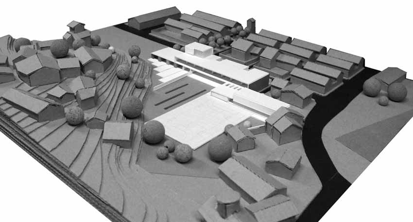 L'edifici se situa de forma lineal amb les directrius de la trama ortogonal i consolidada de les edificacions mes pròximes. El volum principal se situa amb potent façana a carrer i el segon volum, corresponent al gimnàs es disposa de forma paral•lela en un segon terme. D'aquesta manera es deixa que l'espai buit es fusioni amb els diferents límits irregulars del solar corresponents a un entorn més dispers i divers. Tenint en compte l'escala petita de les edificacions més properes, el projecte opta per reduir el seu impacte construint només dues plantes. La forma se materialitza a partir de la juxtaposició i superposició de dos volums simples, amb una marcada component horitzontal que cerca la visió panoràmica de l'exterior. L'edifici que en façana a carrer es mostra més tancat i introvertit, un cop a dins es més obert i atent dirigint la seva mirada cap a les edificacions més antigues del nucli urbà L'accés peatonal pel carrer Esperança serà l'arribada natural. Coincidint amb el passeig verd central del barri la planta baixa de l'edifici es recula provocant un eixamplament de l'espai de vorera, creant un lloc de trobada per a la organització dels accessos, les esperes i transicions, possibilitant tenir un accés independent per l'àrea d'educació infantil. L'espai del patis quedarà definit entre l'edifici i el talús que conforma el turó del nucli antic del poble. Tot el programa es desenvolupa en el volum principal de dues plantes a excepció del volum de gimnàs-vestidors que es desenvolupa en una única planta i es situa de forma paral•lela més en contacte amb la pista poliesportiva.