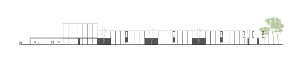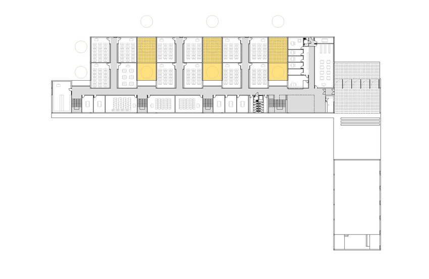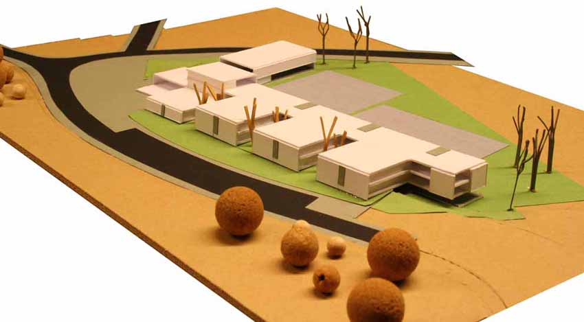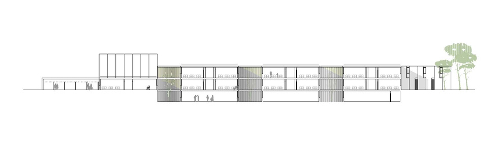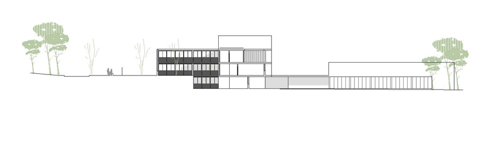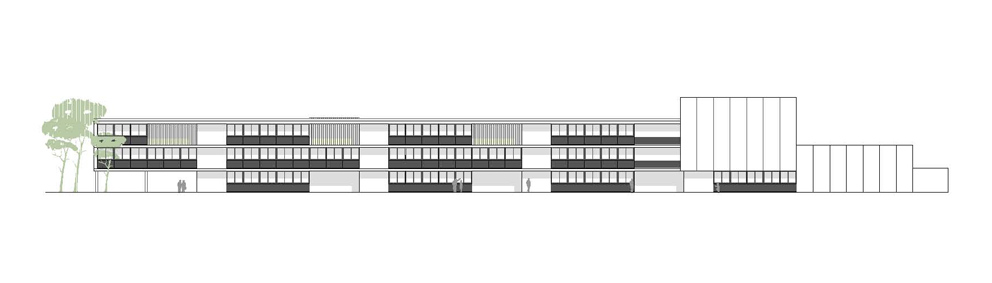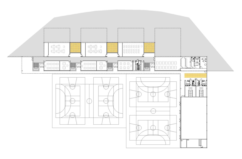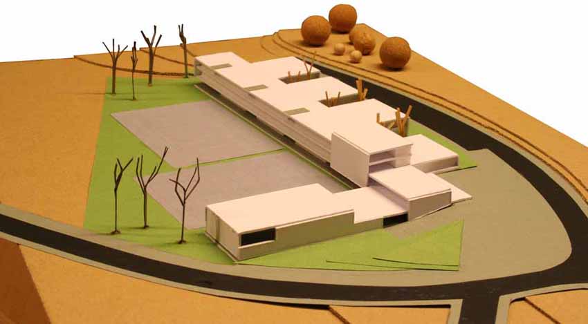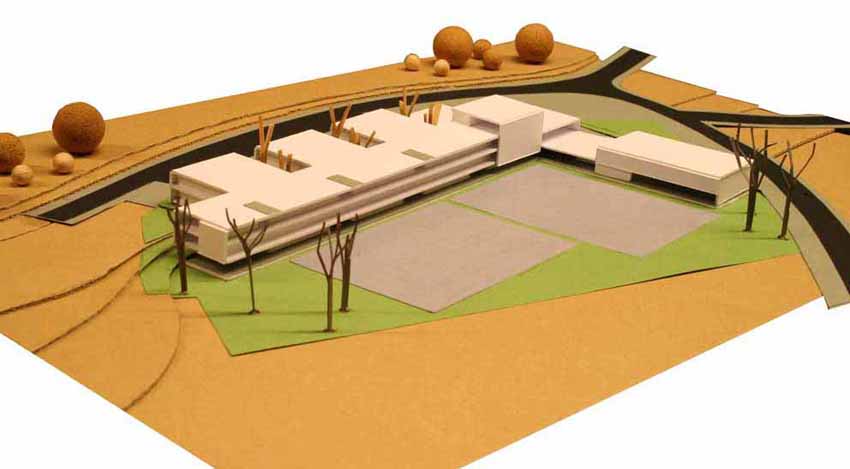 El projecte parteix de dos principis: d'una banda, recollir i reforçar la traça existent del camí de la Ciutadella i de l'altre cercar, amb la seva disposició i formalització, les millors vistes i orientació. L'edifici es compacta i se situa de forma lineal paral•lel a la línea de desnivell existent entre el camí d'accés existent i l'explanació del solar, deixant el màxim de solar lliure per a les pistes i la previsió de futura ampliació i cercant que els espais exteriors resultants quedin ordenats de la manera més aprofitada possible. En façana a carrer (al nord) es mostra més proper al vianant, reduint la seva dimensió. La façana es fragmenta, intercalant uns patis, i aparenta només dues plantes aprofitant el desnivell topogràfic existent. En façana est (nou carrer) es preveu un accés lateral secundari al volum del gimnàs i altres serveis externs, per al seu ús fora de l'horari escolar. L'edifici s'articula en dos volums lineals disposats en forma de L. Tot el programa es desenvolupa en el volum principal de tres plantes a excepció del gimnàs-vestidors i altres serveis que es desenvolupa en una única planta i es situa de forma perpendicular més en contacte amb les pistes poliesportives. Per tal de compactar més l'edifici, tant a la planta baixa com a les dues plantes pis, el programa es distribueix amb passadissos centrals, però sempre cercant que aquests espais gaudeixin de la llum necessària per a un espai que, des del projecte, s'entenen com una zona de moviment i de relació social per a l'alumnat. Apareixen de forma alternada talls que cerquen la llum i es disposen diversos envidraments col•locats estratègicament per cercar transparències i referències de l'exterior.