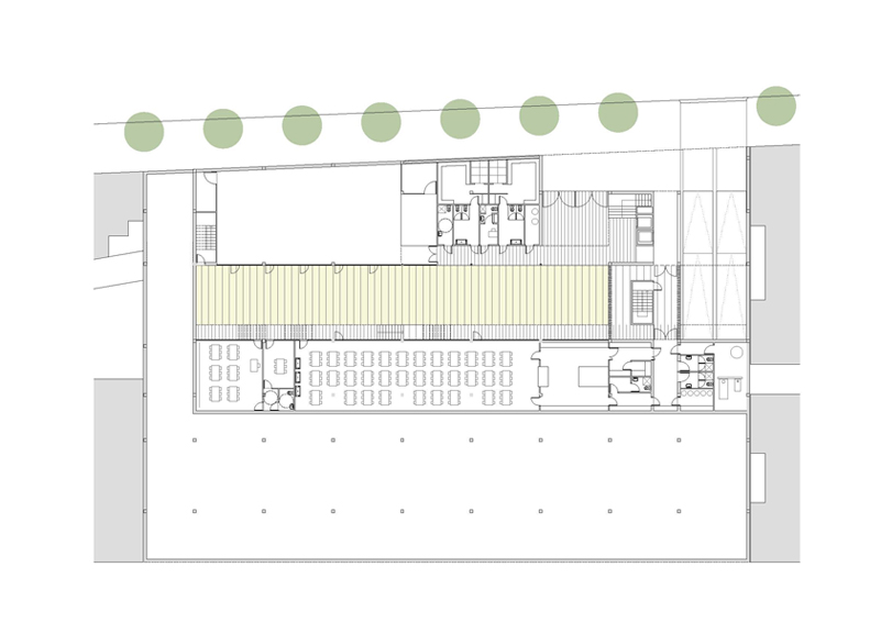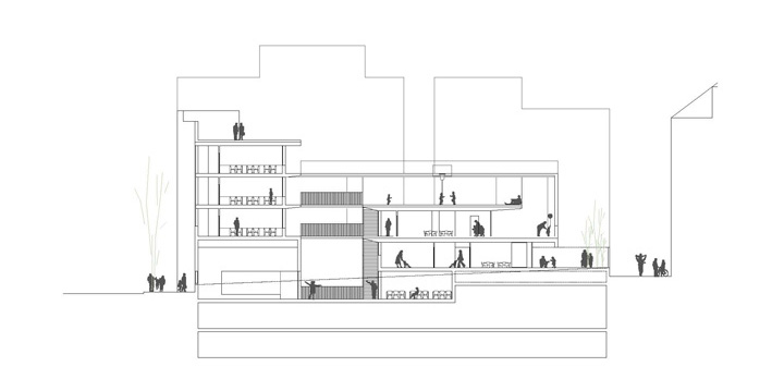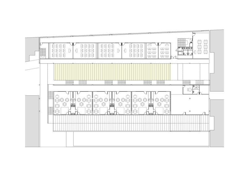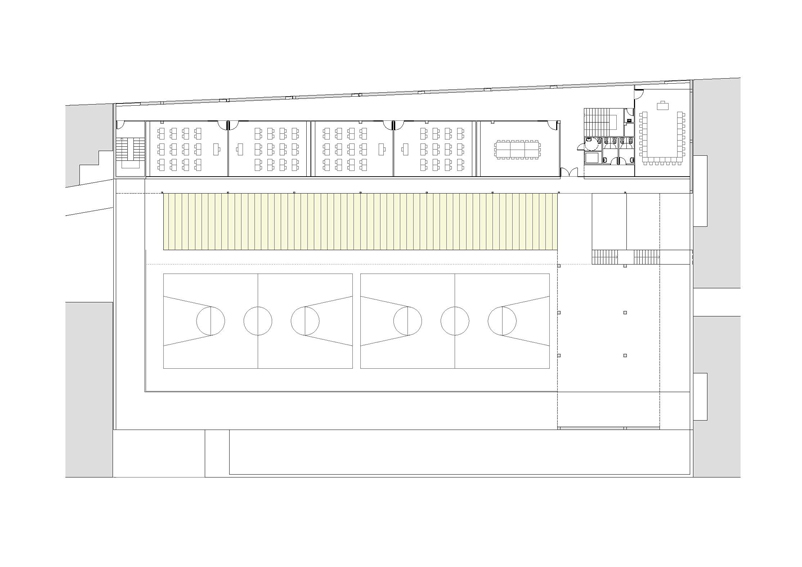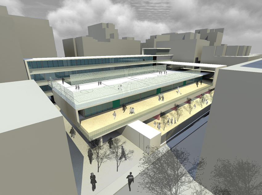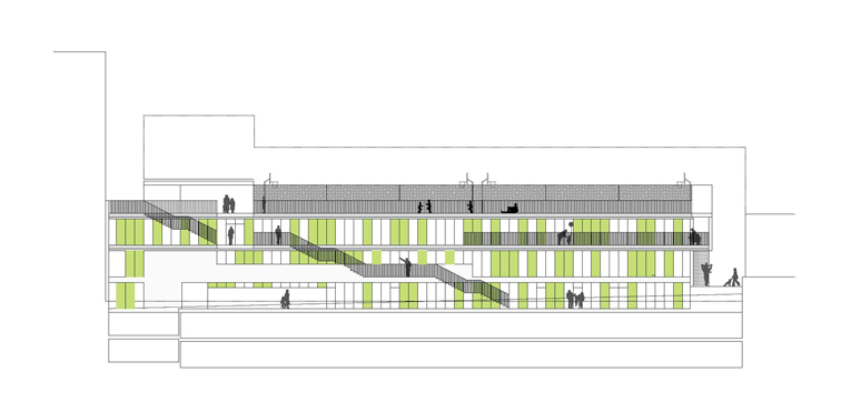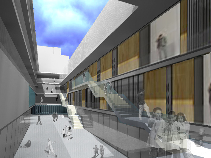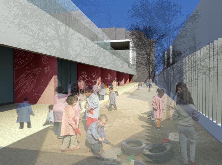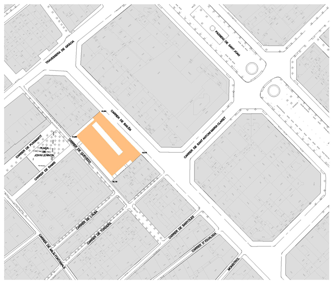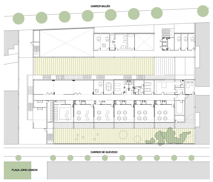 L'escola es tanca al carrer Bailén, fugint del soroll, i s'obre cap al barri de Gràcia, més tranquil i d'edificacions més baixes i afables. L'edifici, que mostra la seva màxima dimensió i alçada al carrer Bailén, s'esglaona cercant el diàleg amb les edificacions més baixes i minimitzant l'impacte de les grans mitgeres laterals. L'edifici que gira en forma d' "U", abraça el pati lineal central, eix de comunicacions per a connexions ràpides i directes. L'accés principal a l'escola es produeix pel punt més baix del carrer Bailén. L'accés a l'escola bressol es resol en planta primera pel carrer de Quevedo, mitjançant un eixamplament de la vorera i aprofitant el desnivell de 2,80 m existent entre aquest punt i la cota d'accés a l'escola. Paral•lelament, existeix un accés secundari a educació infantil, des del passatge que comunica Bailén amb la Pl. John Lennon, mitjançant unes escales exteriors directes. L'accés a l'aparcament es produeix pel punt més baix del carrer Bailén, a prop de l'accés a l'escola. Es preveuen 2 accessos peatonals que, tenint en compte el tancament del passatge a la nit, es situen respectivament a banda i banda. Un al carrer Bailén i l'altre coincidint amb la Pl. de John Lennon. En planta baixa es disposa el vestíbul d'accés principal al CEIP, els serveis comuns (gimnàs-vestidors, menjador-cuina, biblioteca) i l'ampa. En planta primera l'administració, en contacte visual directe amb el vestíbul de planta baixa mitjançant un doble espai. En plantes pis, al volum de Bailén, es disposen les aules de primària abocades cap a l'espai de pati, cercant la màxima tranquilitat, mentre que en planta segona, al volum de Quevedo se situa l'aulari d'infantil i sobre la seva coberta el pati i pistes de primària. L'escola bressol se situa, de forma independent al volum del carrer de Quevedo, a sota de l'aulari d'infantil.