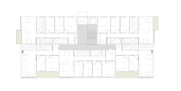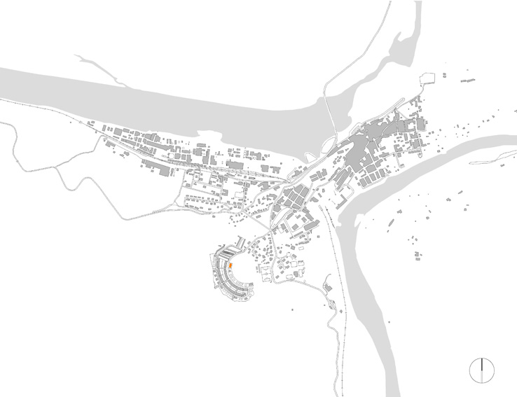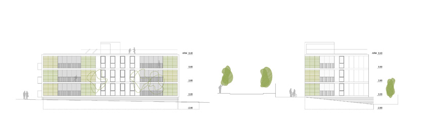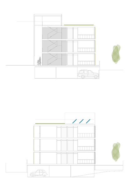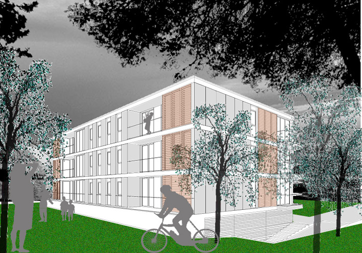 Es proposa una edificació aïllada de volumetria lliure que s'encabeix dins la geometria curvilínia del solar amb una forma absolutament rectangular i ortogonal per tal d'afavorir la industrialització, repetitivitat i coordinació dimensional del projecte. L'edifici té una orientació clarament est-oest amb les dues façanes longitudinals, la façana principal situada a 6 metres del carrer i orientada a l'oest, i la posterior orientada a est. Als testers el volum aprofita la possibilitat d'obrir finestres per cercar la llum i la bona ventilació. A nivell de programa el projecte s'estructura en: una planta soterrani destinada a aparcament i una planta baixa i dues plantes pis destinades a us residencial. L'edifici es composa d'un únic nucli de comunicació, el qual dona accés a 5 habitatges per replà, 3 de tres dormitoris i 2 de dos dormitoris i es resol amb la combinació de, només, dues tipologies d'habitatges. A l'interior dels habitatges la disposició de totes les sales d'estar a la cantonada intenta que aquestes gaudeixin d'una il•luminació més homogènia així com del màxim número d'hores d'assolellament directe. En façana est, la profunditat del bloc i la disposició del programa dels habitatges de dos dormitoris ens permet alliberar una mica de superfície per destinar-la a terrasses situades a la zona dels dormitoris amb accés des de la sala d'estar. La disposició en cantonada de la majoria dels habitatges unit a l'efecte xemeneia del nucli d'escales permet gaudir de ventilació natural creuada. A l'aparcament queda garantida per les obertures en façana, evitant la necessitat de ventilació mecànica.
