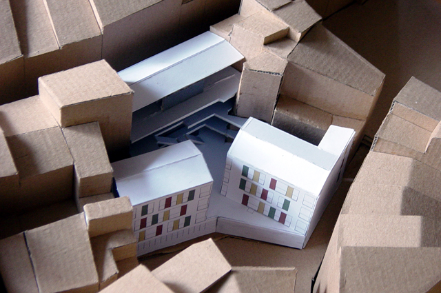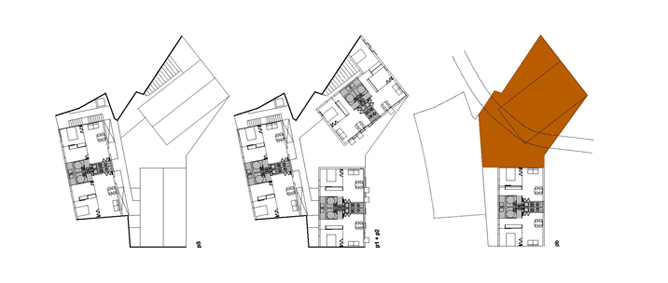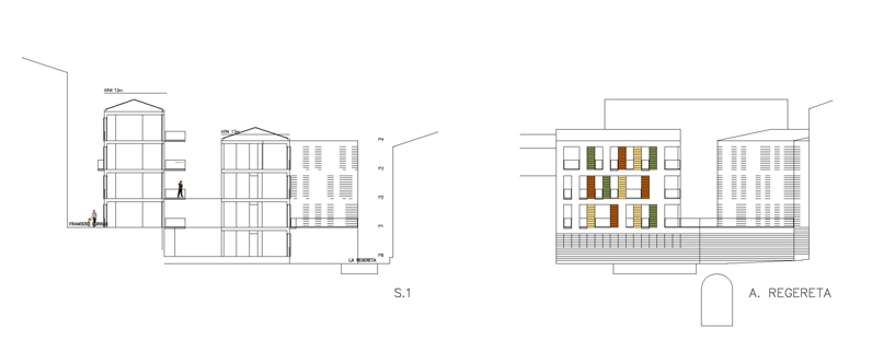 Volíem intervenir dins i fora, cercar una unitat entre el projecte i l'entorn, una major qualitat pels habitatges i per l'espai exterior. No volíem un pati tancat on la zona interior quedés ombrejada. S'aprofita la llum que entra a través de la placeta que es genera amb el safareig i es condueix cap a l'interior. El projecte es converteix en un embut de llum a través dels forats i retranquejos en alçada que deixa la seva volumetria.