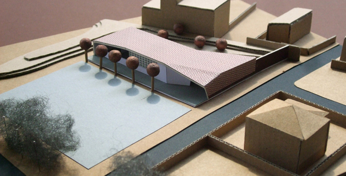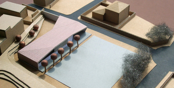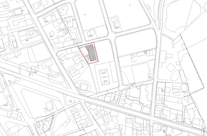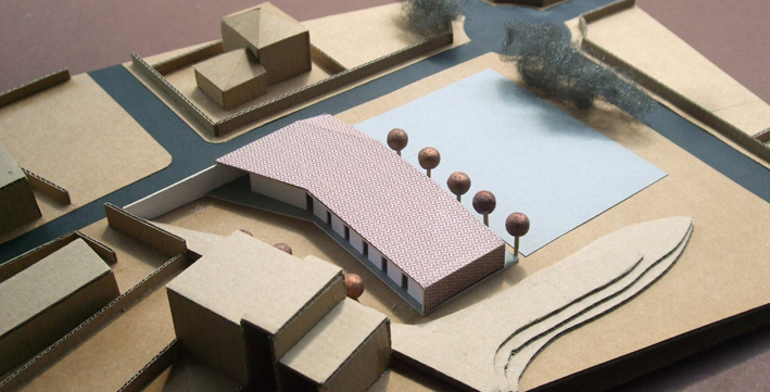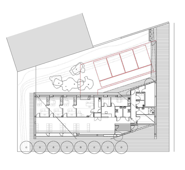 L'edifici es mostra molt tancat i hermètic respecte als potents edificis que l'envolten amb obertures molt puntuals i controlades. Tenint en compte la reduïda dimensió del programa, el nou consultori es resol amb un edifici d'una única planta que es modela tractant de donar resposta tant a l'entorn que l'envolta com al programa funcional que alberga i als seus requeriments. El nou volum es disposa de forma lineal aprofitant la dimensió total de llargada de 30 m amb front al futur aparcament. En la trobada amb el carrer Xaloc, l'edifici es doblega reculant i fent un plec enrera. Així, amb aquest únic gest, permet crear un espai d'acollida i alhora s'aproxima l'edifici a les edificacions del darrera equilibrant la dimensió del pati resultant. Simultàniament les cobertes s'inclinen suavitzant la forma de l'edifici i cercant un diàleg amb les construccions més properes. Aquest fet permet alhora jerarquitzar els espais interiors i guanyar alçada a la sala d'espera. El volum de diferents alçades, mitjançant el joc de cobertes inclinades, se situa dins el solar creant un espai propi i més introvertit. El pati es el mecanisme que esmorteeix i filtra l'exterior cap a l'interior. Permet donar certa intimitat a les consultes però alhora soluciona la dura visió de les mitgeres, que en gran part quedaran ocultes pel nou edifici i la seva tanca. Des d'aquesta disposició el nou consultori es mostra atent al paisatge i un gran finestral cerca les millors vistes, cap al Montgrí, des de la sala d'espera. La disposició compacta i ordenada del volum dins el solar permet deixar gran part d'aquest lliure per a possibles futures ampliacions que es podrien encabir, dins el pati, amb gran facilitat de connexió.